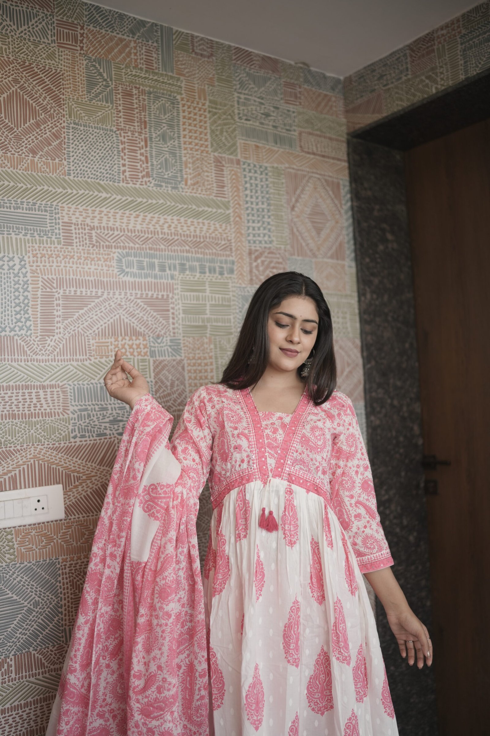 | Color Tone | Elegant blush pink and white with intricate paisley print |