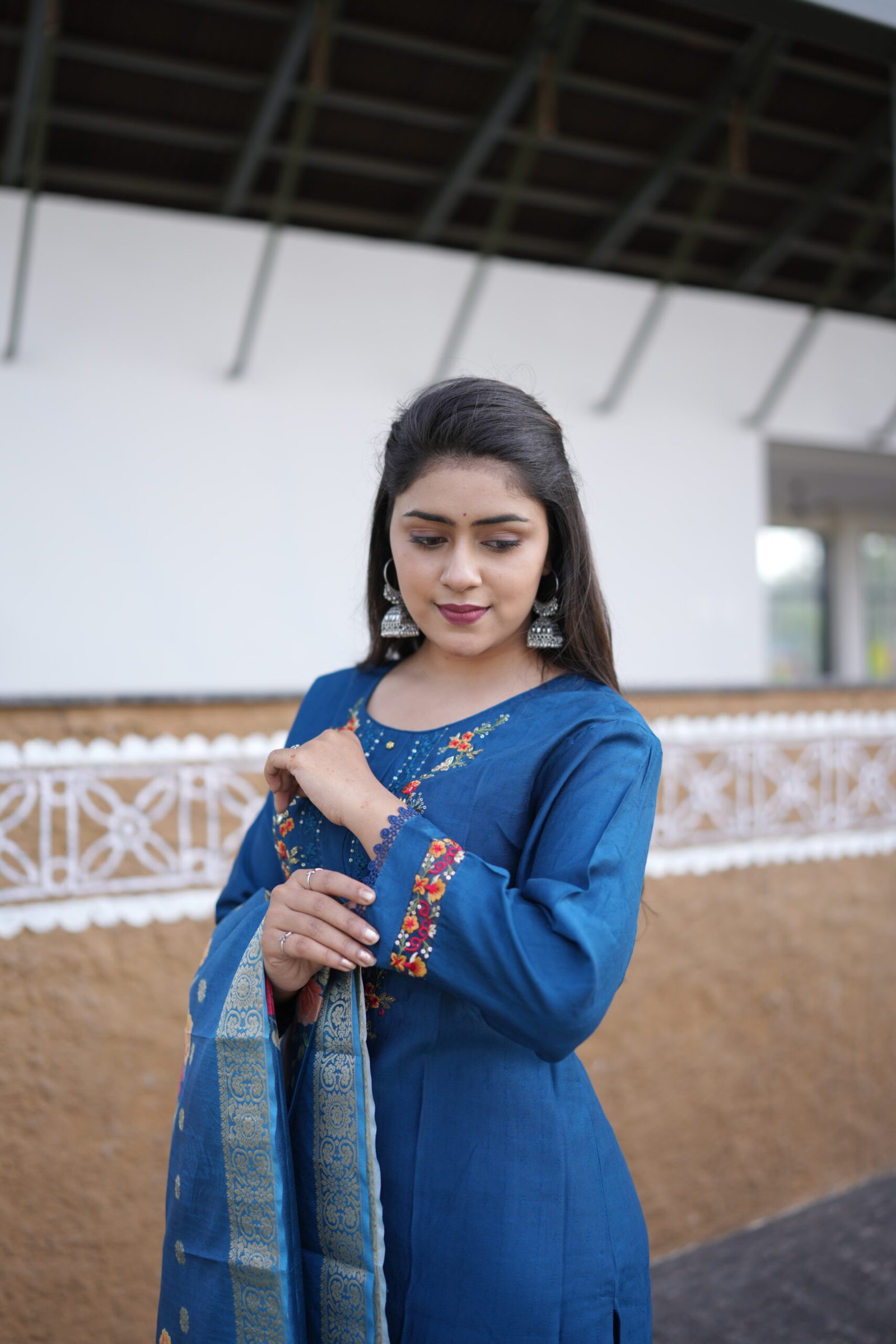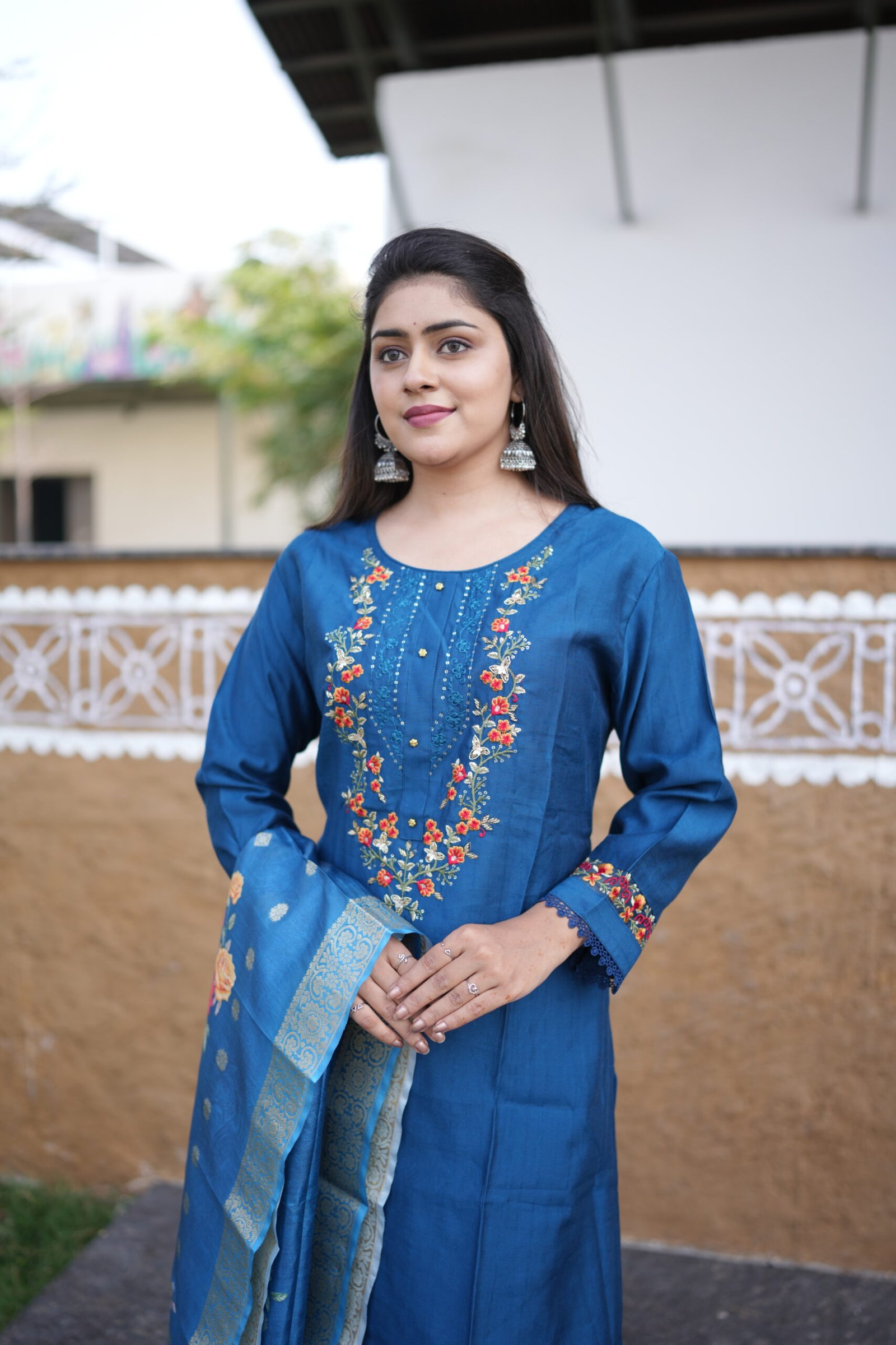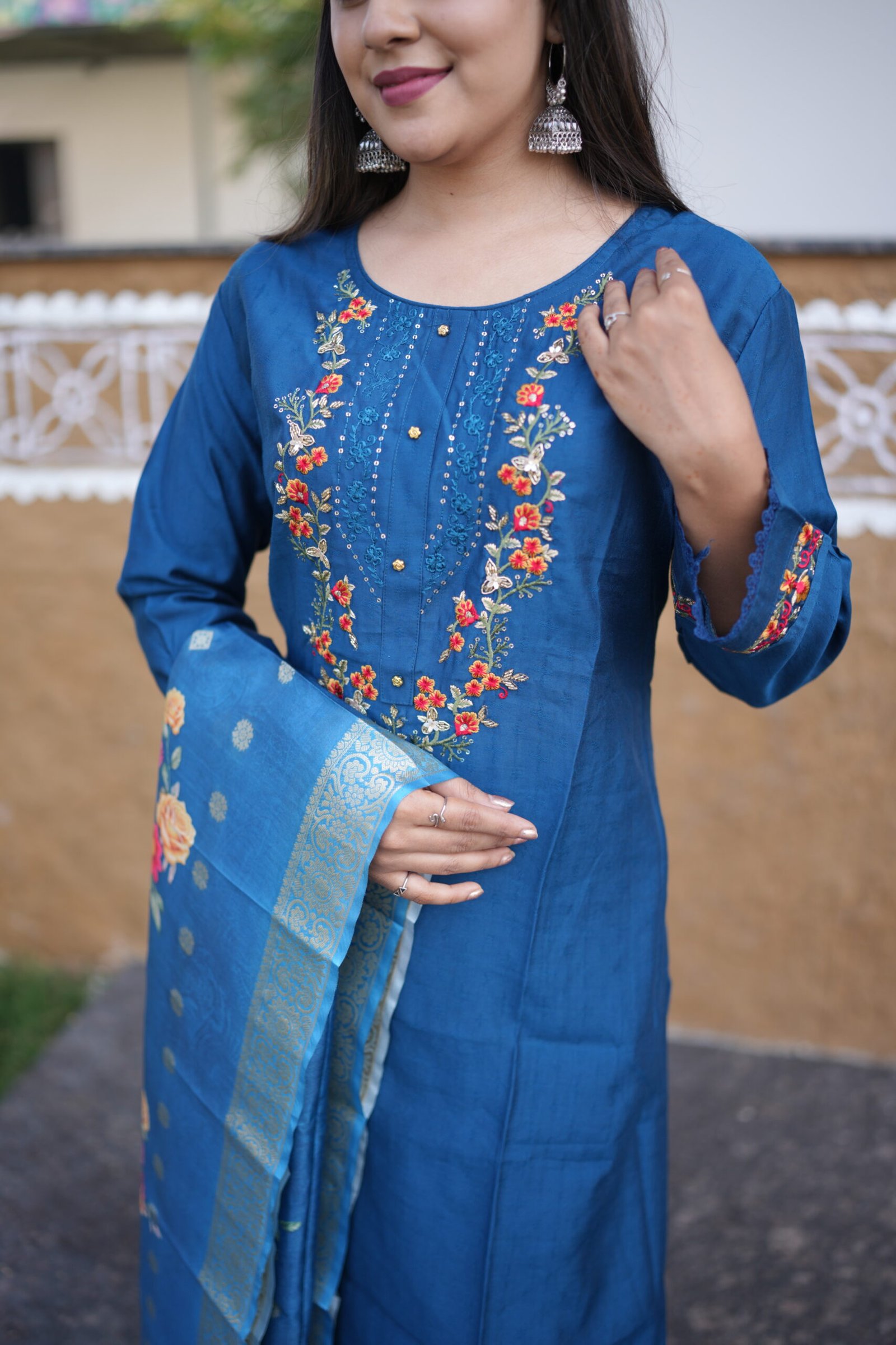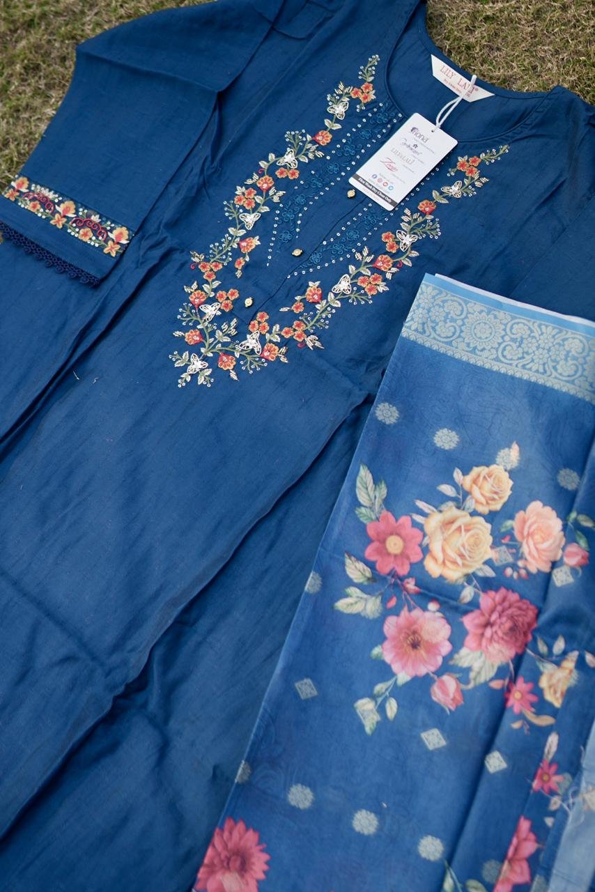 1The Midnight Charm Embroidered Kurta Set combines classic grace with a contemporary touch. Crafted from a premium silk-cotton blend, the ensemble features a deep midnight blue base enhanced with intricate multicolor thread embroidery along the neckline, sleeves, and hem. The vibrant floral detailing adds warmth to the elegant tone of the fabric. The look is completed with a soft organza dupatta showcasing exquisite floral digital prints. Perfect for festive occasions, semi-formal events, or family gatherings, this outfit offers a refined balance of comfort and tradition — a must-have for those who appreciate understated luxury and detailed craftsmanship.