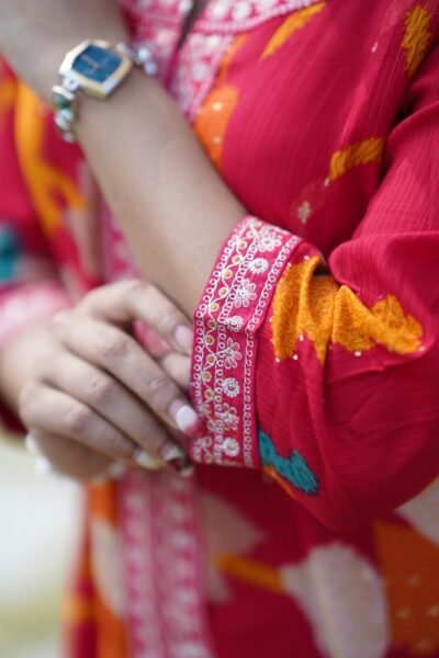 Preserve your Ibarat suit’s beauty by dry cleaning or gentle hand washing with mild detergent. Avoid wringing or direct sunlight. Iron lightly on low heat. Store in a breathable garment bag to maintain fabric texture, embroidery, and color brilliance for timeless elegance.